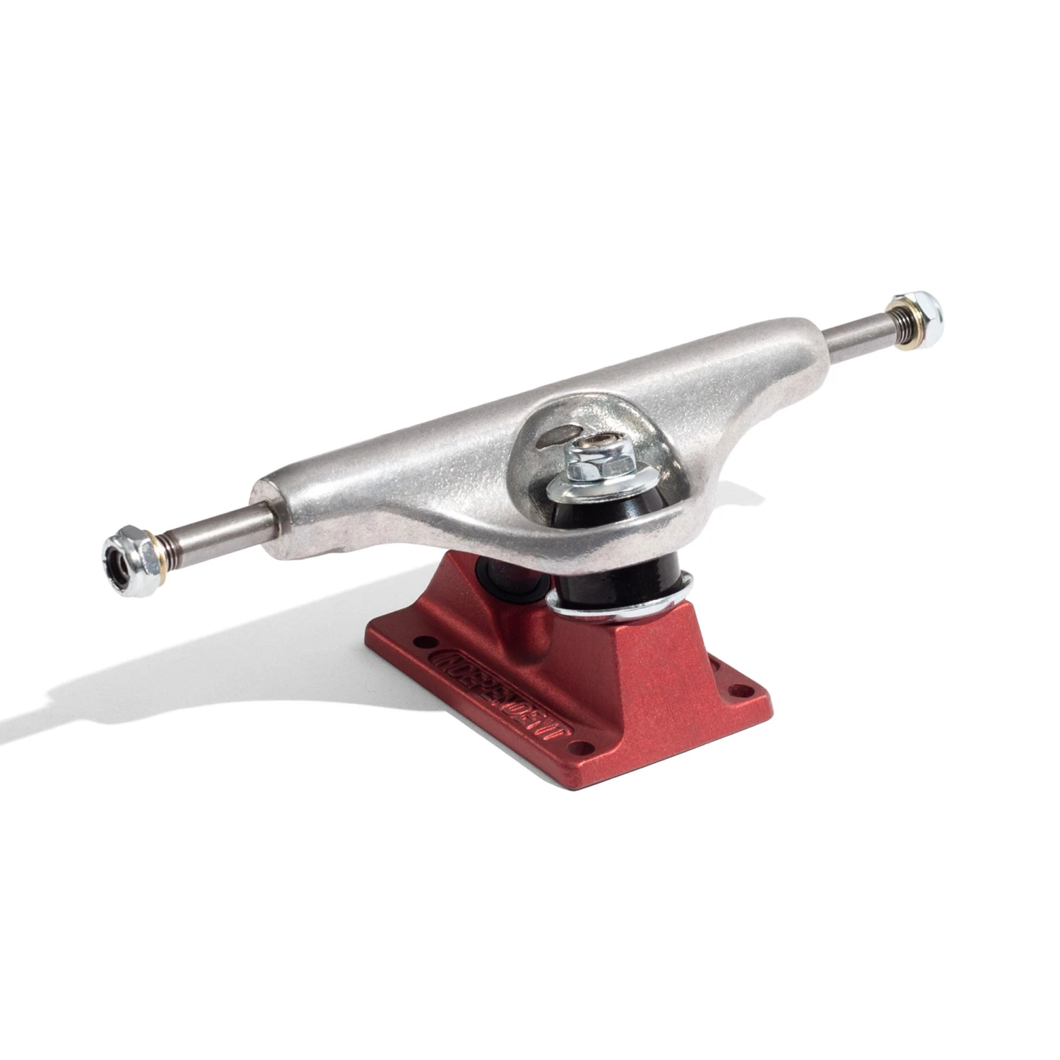 - Independent Trucks Stage 11 Hollow Silver Ano Red trucks with polished silver hanger, anodized red baseplate, hollow laser etched logo under hanger, black cushions, and silver hardware.