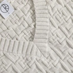 - Loose ribbed V-collar and hems.